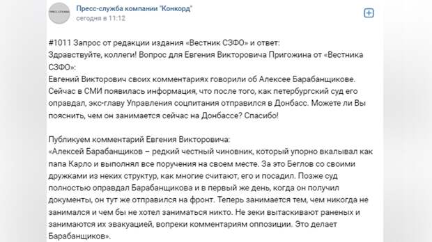 После этого он сразу отправился на фронт. Пригожин считает экс-главу Управления соцпитания редким честным чиновником, который упорно работал и выполнял все поручения на своем месте.«За это Беглов со своими дружками из неких структур, как многие считают, его и посадил. Позже суд полностью оправдал Барабанщикова и в первый же день, когда он получил документы, он тут же отправился на фронт. Теперь занимается тем, чем никогда не занимался и чем бы не хотел заниматься никто. Не зеки вытаскивают раненых и занимаются их эвакуацией, вопреки комментариям оппозиции. Это делает Барабанщиков», — приводит слова Пригожина пресс-служба компании «Конкорд».